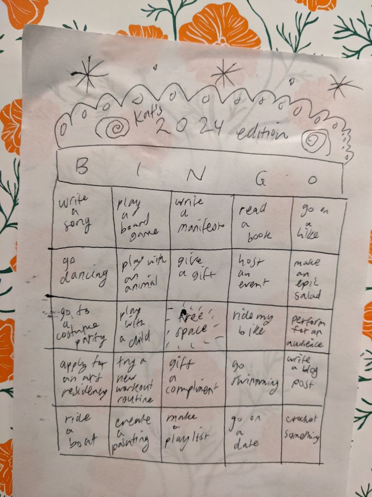 🎵 Write a Song: My friend Jeremy and I wrote a song together (yet to be released).🎲 Play a Board Game: Kevin and I played Consentacle (BoardGameGeek).✍️ Write a Manifesto: I wrote an academic statement of purpose for my grad school application.📚 Read a Book: I recommend Come as You Are (ThriftBooks).🥾 Go on a Hike: Eric took me to admire Joaquin Miller Monuments.💃 Go Dancing: Johannes took me to an epic rave put on by Endzeit.🐾 Play With an Animal: I pet cats, but I might rate this incomplete. Maybe next year I’ll fully play with one!🎁 Give a Gift: I gave Hunter an embroidered bird.🏠 Host an Event: I was the hostess at Wetside of the Lake (blog post).🥗 Make an Epic Salad: I made Pedro an amazing salad set (one sweet, one savory) while we were psychonauts. He said the croutons tasted like metal—haha!👗 Go to a Costume Party: I went to a dance party with Andy where the theme was lace and leather. I crafted my dress into a two-piece with runner’s shorts.👶 Play with a Child: Dmitriy and I played with his daughter at the cafe at the Murakami exhibit at the Asian Art Museum using the sticky tickets they give you.🚀 Free Space Ride: I did not include a free space in next year’s bingo.🚴 Ride My Bike: I rode my bike in the summer with Xris—this was also our boat date!🎤 Perform for an Audience: Many performances! I did a poetry reading at Grand Opening (a now-defunct DIY venue).🌍 Apply for an Art Residency: I applied for the Poland Residency and was accepted, but I didn’t follow through due to organizational and personal distractions—probably for the best.🏋️ Try a New Workout Routine: Not completed.💌 Gift a Compliment: I often make observations or use compliments persuasively. I could be more intentional about this next year.🏊 Go Swimming: Hunter and I went swimming a few times.📝 Write a Blog Post: I made a few this year.🚤 Ride a Boat: I went on a free Alameda ferry ride for a second date with Xris.🎨 Create a Painting: I made a cool parrot painting using a stencil, watercolor pencils, and frisket but didn’t post about it.🎶 Make a Playlist: I created a playlist of covers of Hozier’s No Plan because I was planning to learn it.❤️ Go on a Date: So many! A highlight was taking Pedro to see the Mission murals and enjoying pupusas afterward (Panchita’s Pupuseria).🧶 Crochet Something: Best year of crochet yet! Check out the crochet dump.