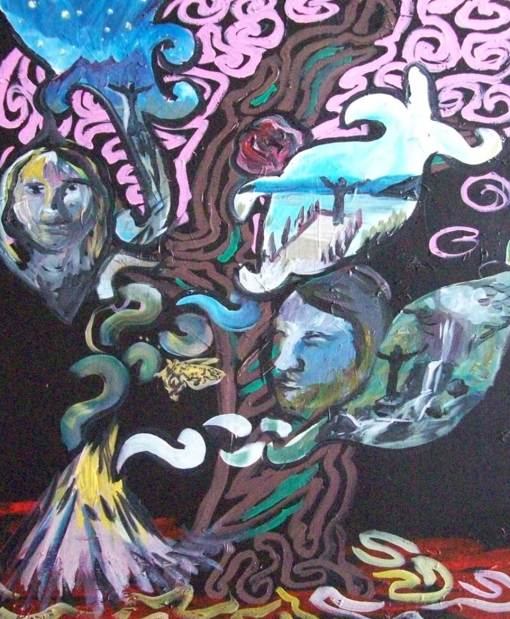 Painting with Matt. He painted the background and I added some elements, trying to match his style. It was a true collaboration. This is one of the few paintings that I actually wanted to have a title for. I believe people are inspiring. These people are shaman of our artistic lives, conjuring visions for us to depict in art. Shaman show the potential that lies within us.