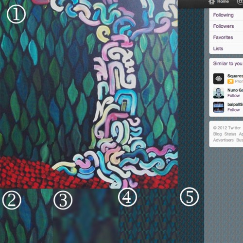I roughly followed this tutorial. It encourages a very small tile to start with, that way your website is taking up less information storage. I used a painting of mine(1) as a starting point, I wanted to recreate the leaf pattern(2). I did not paint the leaves symmetrically, so I took a small sample of the pattern, copied it and rotated it 180 degrees to lay on top of itself (3). Because of the asymmetry of the colors, tiling the sample creates a loose horizontal zig-zag (4). This (5) is what it looks like as my Twitter profile background. Not what I was shooting for, but for a custom pattern done in ten minutes, not bad.